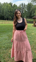 - Elastic Waist Tiered Maxi Skirt - Side Pockets - Drawstring - Ruffle Detail - Midi Dress - W/ Lining - Bohemian, Boho Skirt