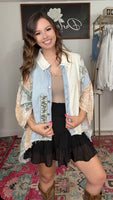 These Boho vibe top features boho style detailing throughout with a lightweight denim material and an oversized fit. This pairs well with so many bottoms! We paired this with our go out skort and our slim wide denim jeans.