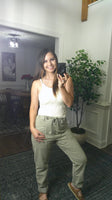 These light olive colored loose and relaxed pants feature a cinched waist and a functional tie! These feature a front cargo style pocket adding a edgy vintage feel. & I mean go ahead and grab the fit too because how cute do they pair with the your go to button ups??