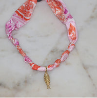A soft blend of sweet Southern charm and bold boutique flair—the Fish Of My Eye Charm Necklace is hand-tied with a silky scarf in shades of blush, red, and pink, finished with a 14K plated gold fish charm featuring a diamond eye. . Wear it wrapped as a necklace, tied to your bag, or styled around your wrist—it’s versatile, giftable, and full of charm.