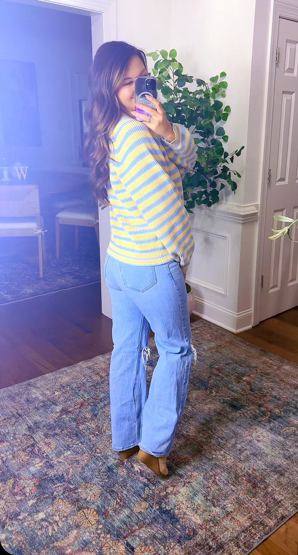 You can’t help but stop your scroll for this cardigan. It’s featured in a yellow and blue color combo with a ribbed detailing! Wear this buttoned up or over a tank for a cute trendy fall look with your favorite to to denim jeans.