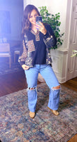This is definitely a staff favorite. This features a acid wash black waffle fabric, with camo, and floral flowing perfectly together. This features a hood and a loose relaxed fit making this perfect for leggings and jeans.