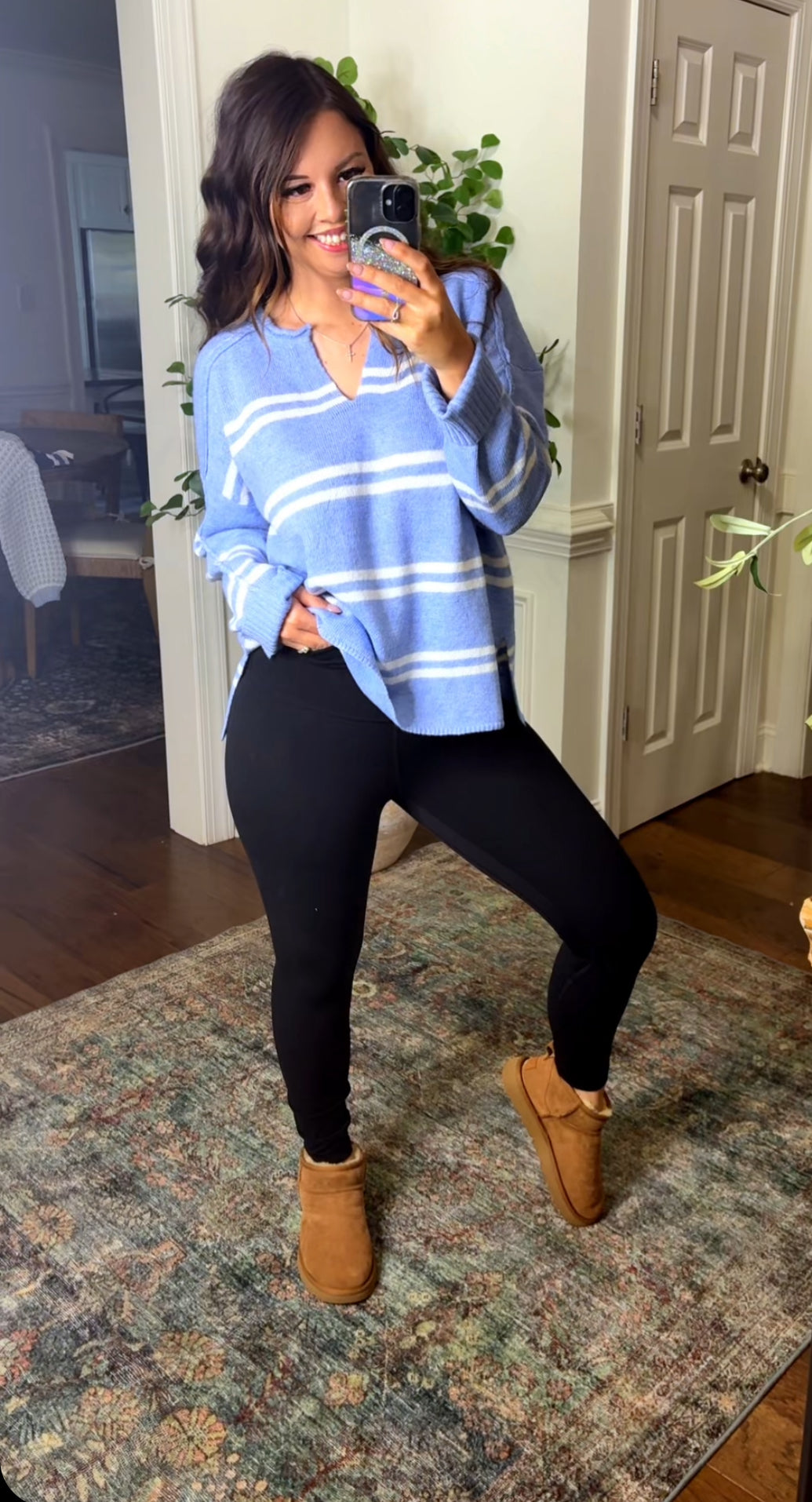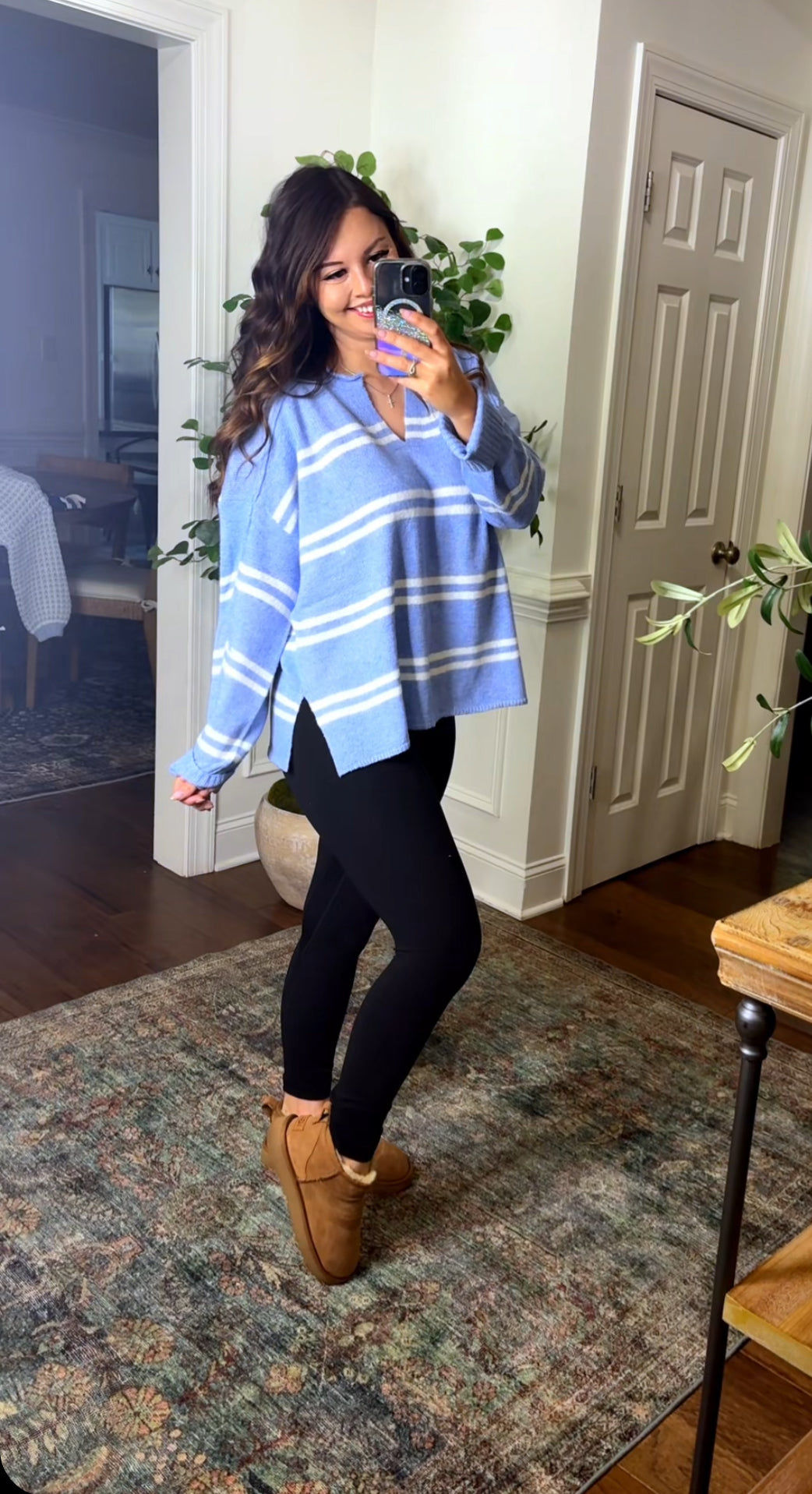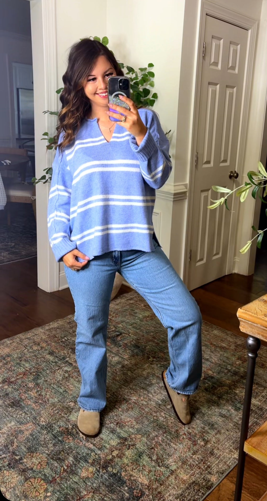 This lightweight sweater features a white stripe and is offered in a beautiful blue color! This loose and relaxed fit makes this perfect for fall and one you’ll continue to reach for. Pair this with leggings or jeans for two cute trendy looks.
