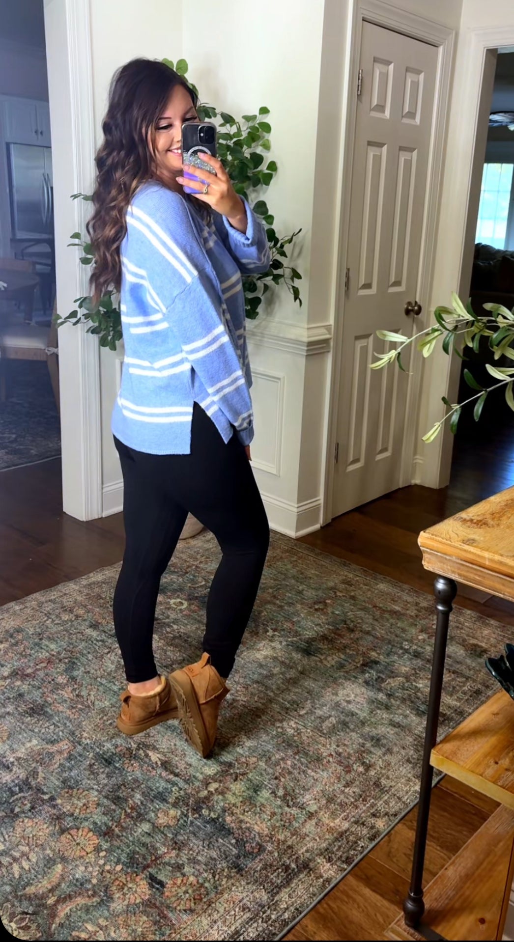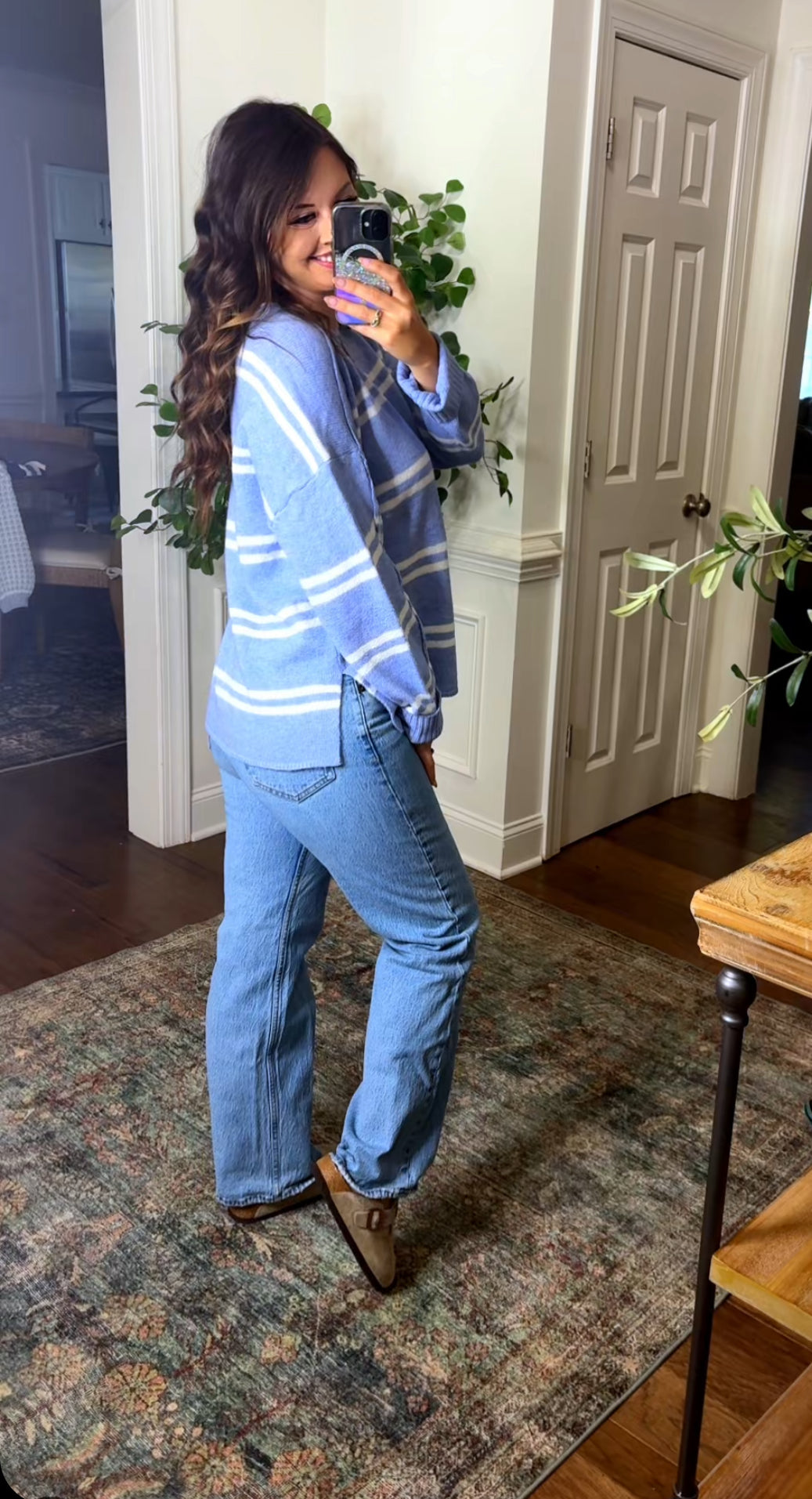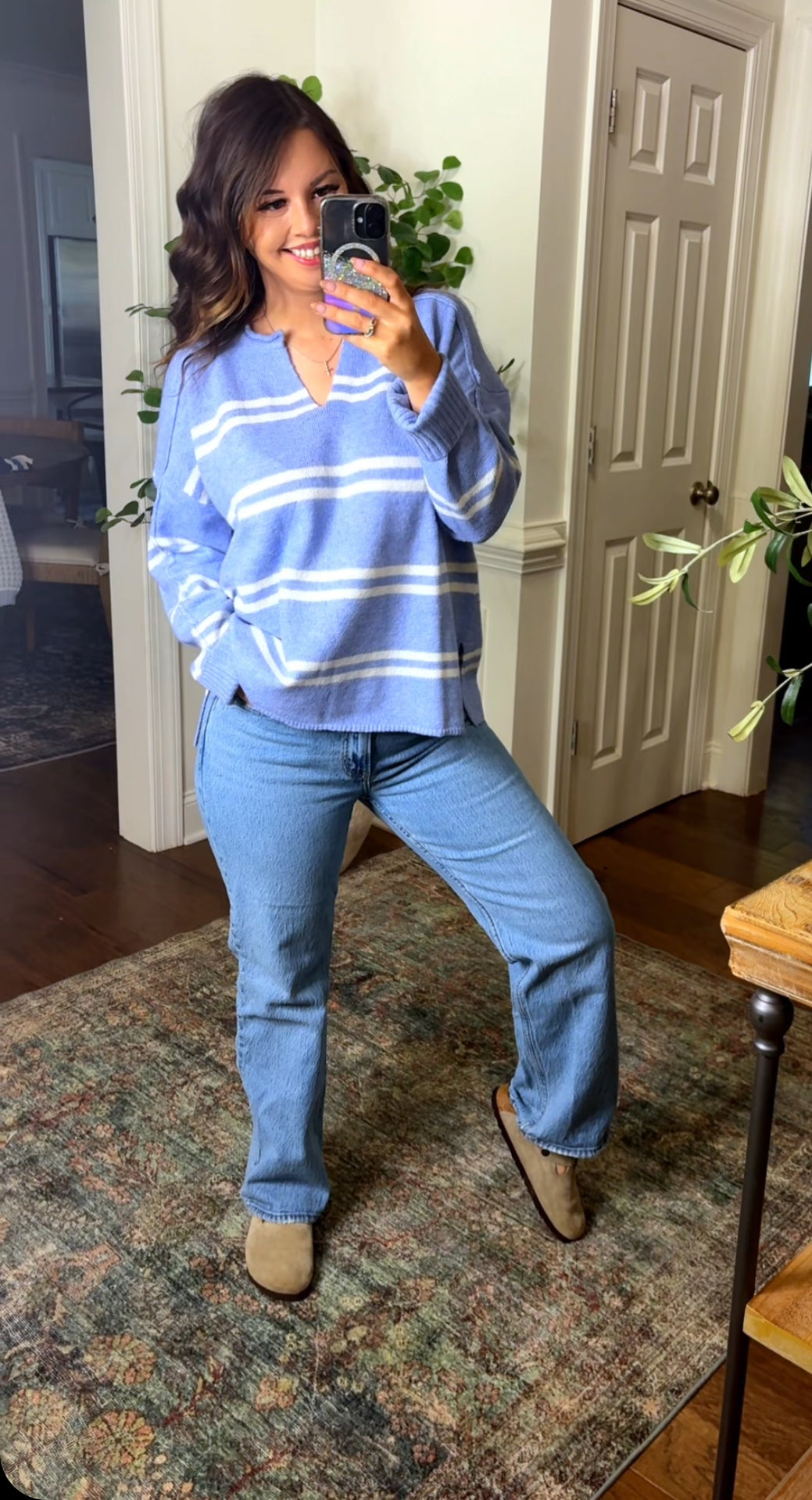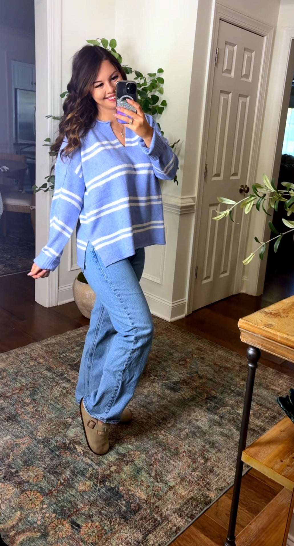 This lightweight sweater features a white stripe and is offered in a beautiful blue color! This loose and relaxed fit makes this perfect for fall and one you’ll continue to reach for. Pair this with leggings or jeans for two cute trendy looks.